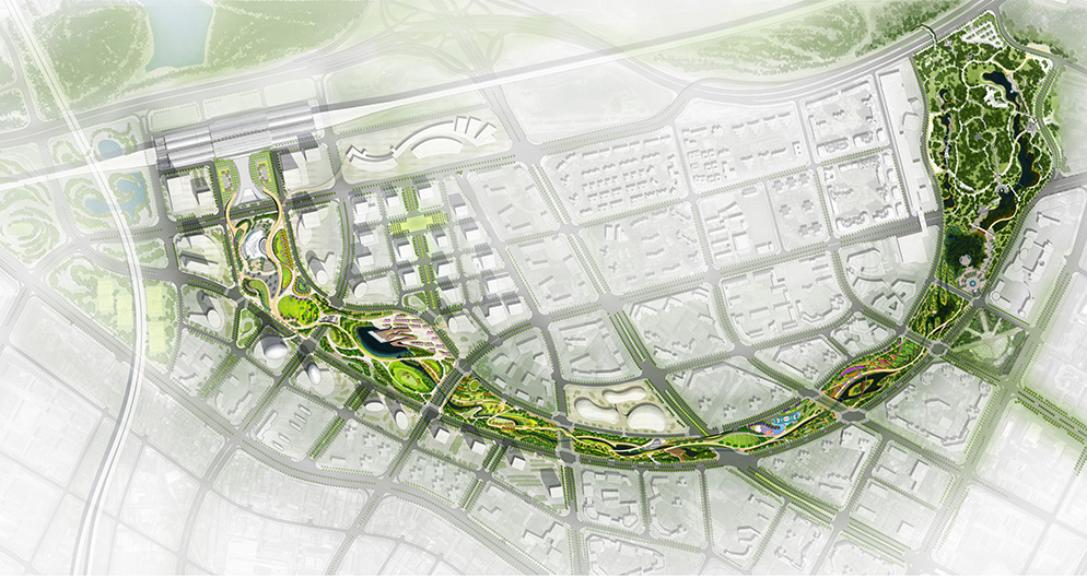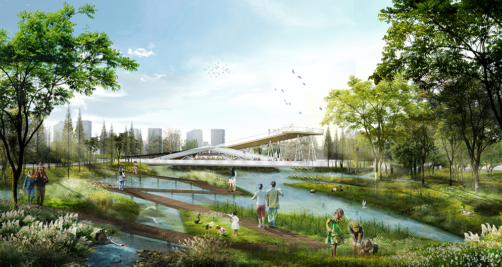 SED新西林在規劃中將項目打造為坪山新區的空間主脈、發展引擎,創建人與自然共生的、具有都市地標性的城市戶外會客廳。以城市生態導向型建設為基礎,應用海綿城市的概念及措施,如生態排水道、濕地、雨水花園、沿街草溝、植草磚停車場等,有效緩解城市中滯洪泄洪、雨水回滲利用、地表徑流凈化、生物遷徙等問題。多重保護生物多樣性、“互聯網+”概念創造智能生態公園,“特色節點水景”、蝶翼跨橋貫連整個半月環公園核心區,使得項目成為一個完整、綠色、生態的復合系統公園。